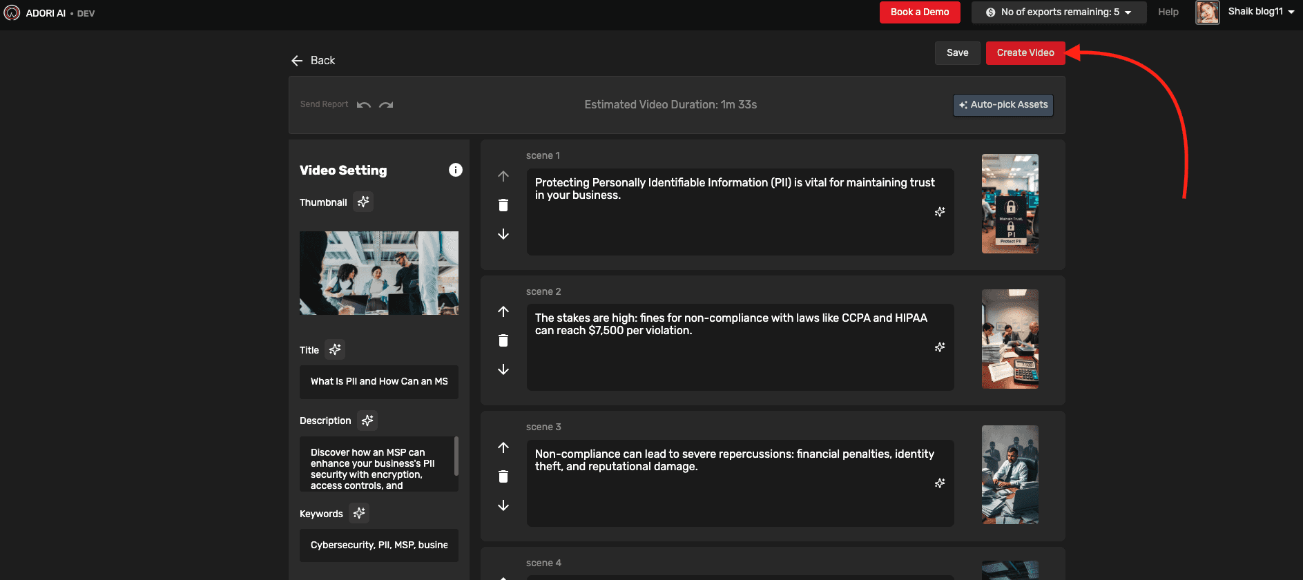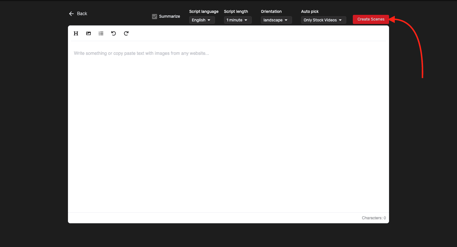 After you're done editing, click on the Create Scene button in the top right corner to generate AI-generated scenes with relevant images.