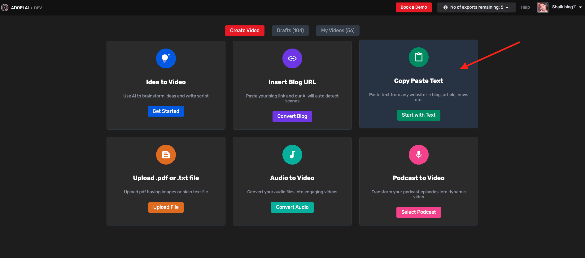 Once you are at homepage on AdoriAI, click on Create Video and choose the “Text to Video” section to convert your text to video.